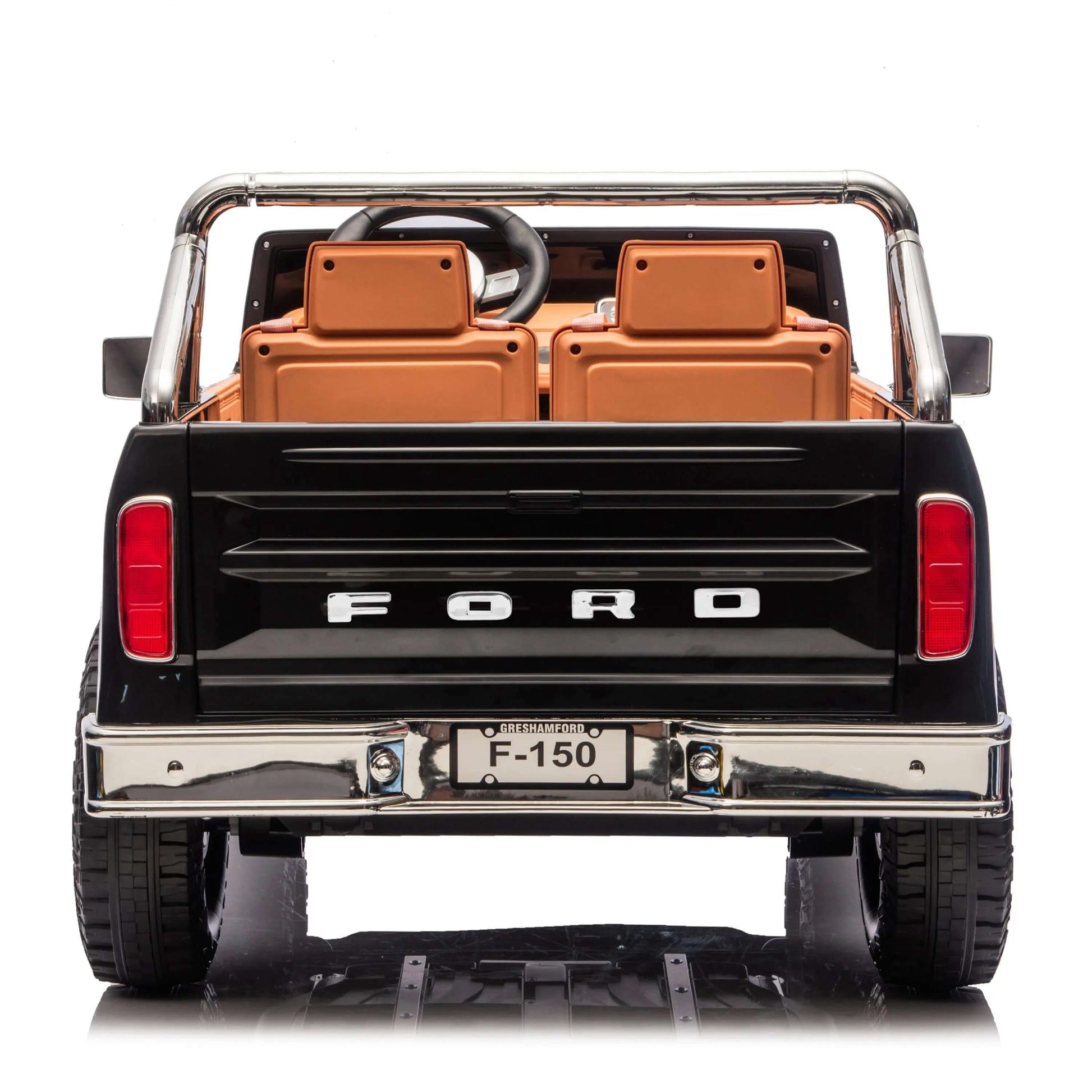 Command the outdoors with the Ford 150 2-Seater Ride-On Truck, a 24V powerhouse built for heavy-duty fun. This "Adventure-focused" beast is equipped with a true 4WD system featuring four 90W motors, making it one of the most capable trucks in its class. Designed for two riders with a combined weight capacity of up to 130 lbs, it features a premium leather bench seat and secure Y-style seatbelts. Whether navigating the backyard or the sidewalk, the puncture-proof EVA tires and rugged suspension provide a stable, smooth ride. Parents can oversee the action with the 2.4G remote control, while kids enjoy a fully loaded dashboard with Bluetooth, FM Radio, and LED lights. With a full hour of run time, this Ford 150 is ready for any mission.