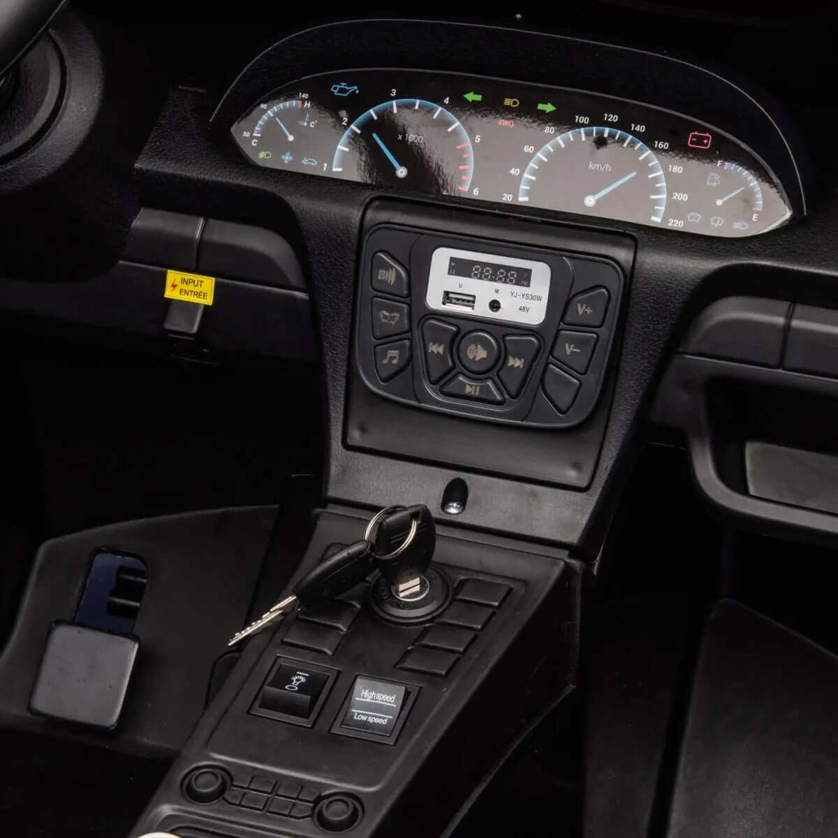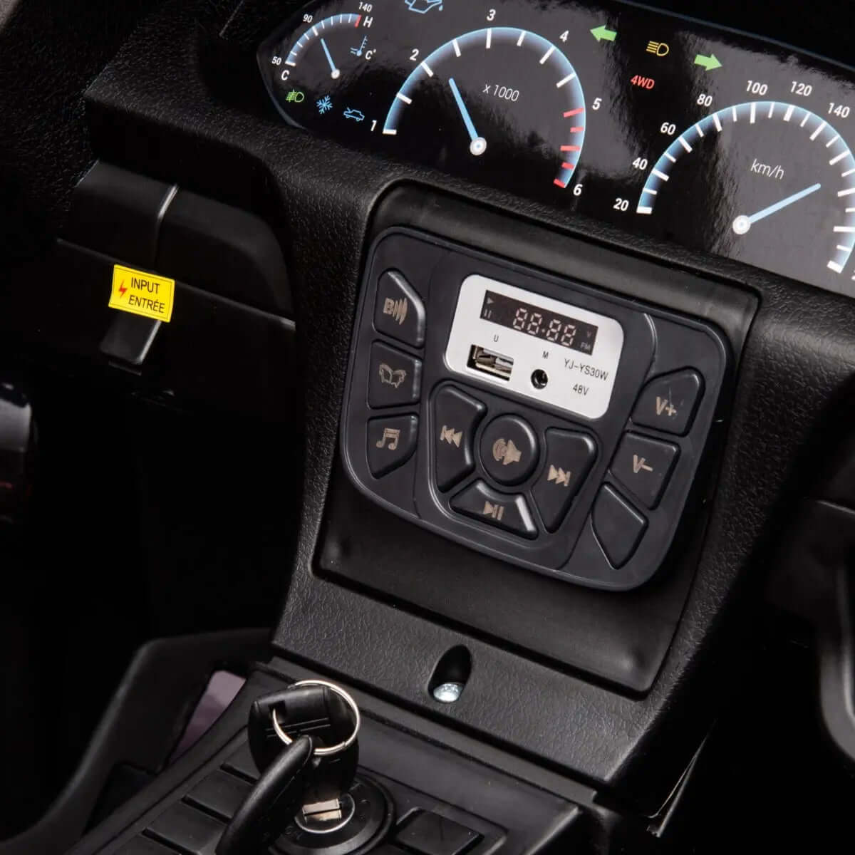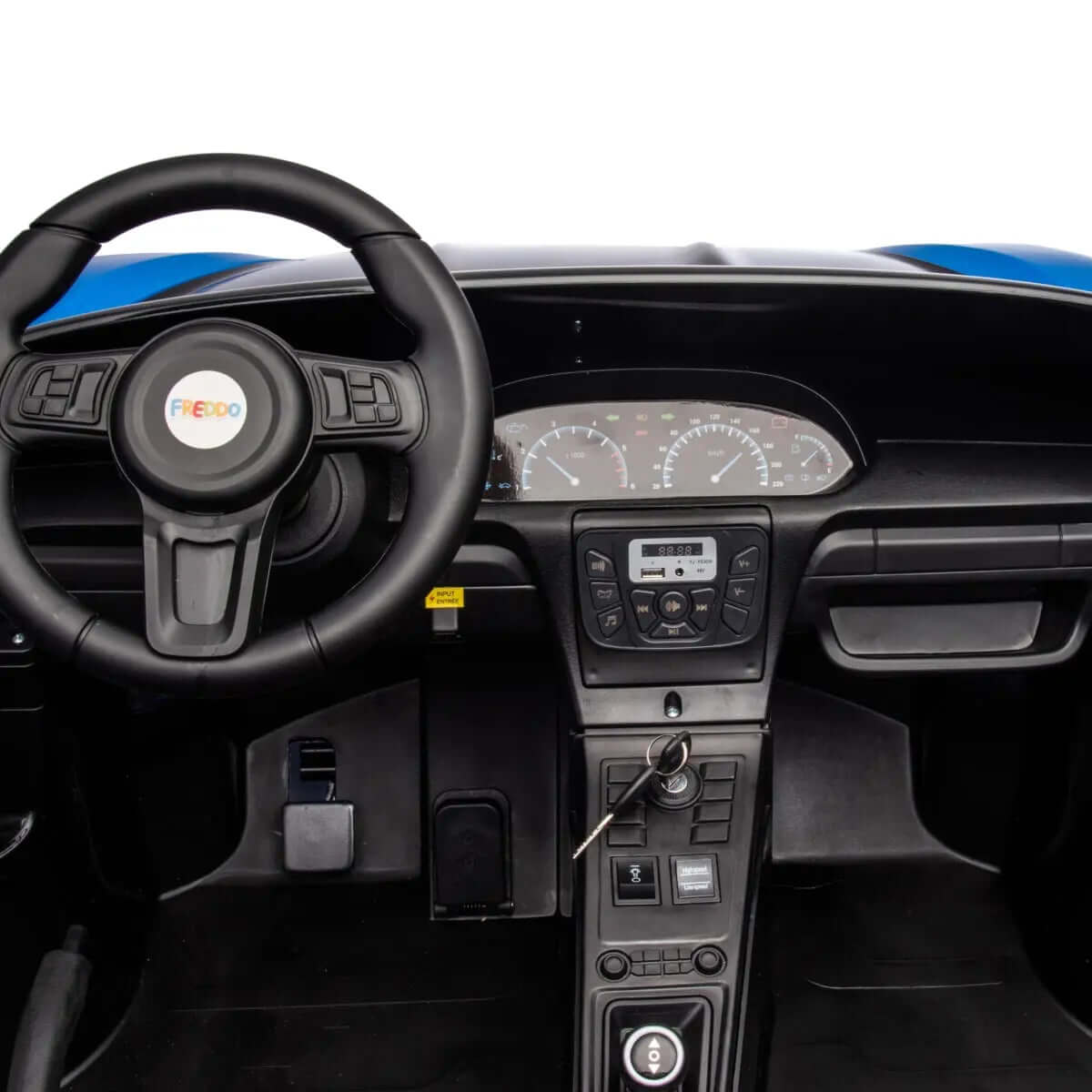 The 48V Freddo Rocket 2 Seater Big Ride on Car for Kids is designed with luxury, fun, and safety in mind. Featuring 2 powerful 24V 14AH batteries and tubeless air tires, this car can easily handle rough terrain and last for hours of playtime. The adjustable leather seats provide a comfortable and smooth ride, while the LED lights and pedal brake keep kids safe. With a maximum weight of 220 lbs, this ride-on car is suitable for kids ages 14 and up. For added convenience and entertainment, the car includes a key start, MP3 + AUX + USB + Bluetooth, and a USB socket. Let your kids take their adventures to the next level with the 48W