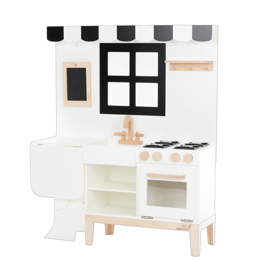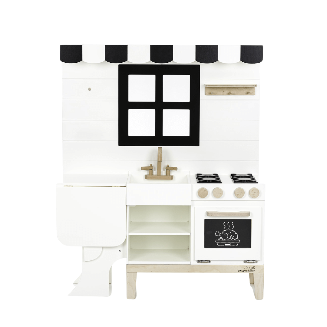 2MamaBees Aviana Gourmet Play Kitchen will create hours of sensory play while also helping your little one explore the world of imagination. The beautiful white and black farmhouse design will create a stunning addition to any indoor play space. The Aviana Gourmet Play Kitchen includes chalkboard with built-in magnets to secure inside oven door. The stove and faucet handles turn and click for sensory play.