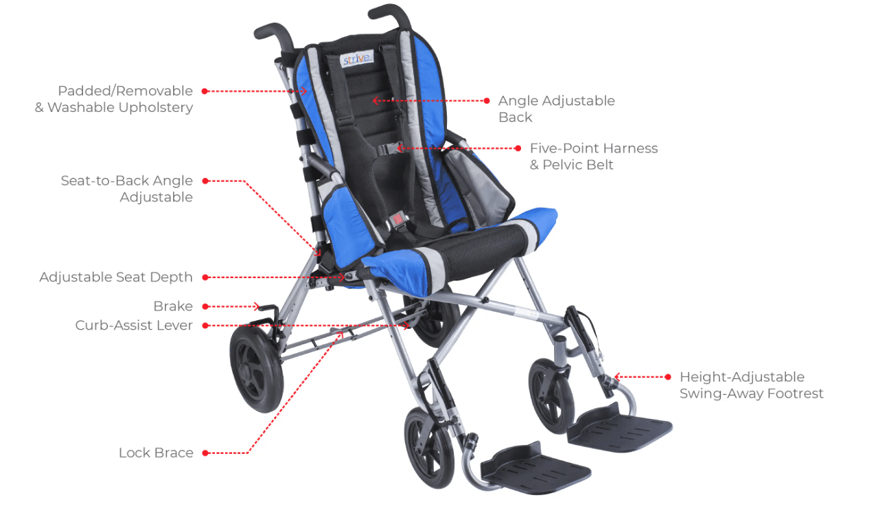 The Strive is lightweight, travel-friendly, and designed for children with disabilities. It provides upper body support, posture maintenance, and full-body positioning, with adjustable tension straps for customized comfort.