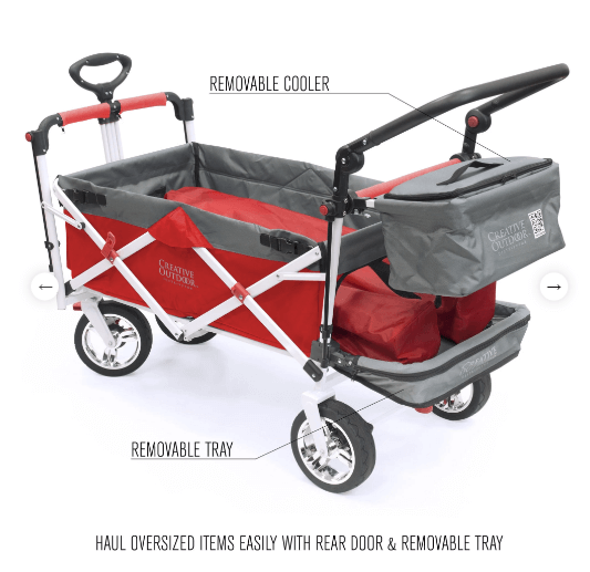The SILVER SERIES Push Pull Folding Wagon comes standard with the following brand new features: rear door for hauling oversized items, removable/fold-up tray to support oversized items (tray can also be used inside wagon for laptop, tablet, books, snacks etc.) and removable cooler.