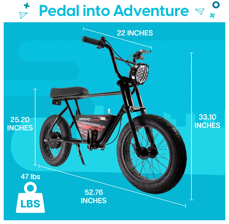 The Droyd Blipper is a fun and safe electric bike for ages 13 and up that's ready to take your growing rider on all sorts of adventures. Simple to set up and ride, the Blipper is packed with an easy-to-use accelerator that goes up to 12.5 mph and a long-lasting 24V battery with a max run time of 60 minutes. With safety as the top priority, the pneumatic rubber tires and UL2272 certification provide parents with peace of mind and riders with a safe yet thrilling experience.