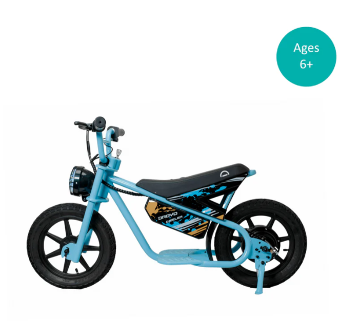 The Droyd Weeler is a fun and safe electric bike for ages 6 and up that's ready to take your growing rider on all sorts of adventures. Simple to set up and ride, the Weeler is equipped with a lithium-ion battery that runs for up to 45 minutes, and two maximum speed limit settings of 6.2 mph (low) and 10 mph (high) using the parental control speed limit key. With safety as the top priority, the Weeler includes parental speed controls, smooth-launch control, brushless motor, and an easy-to-use accelerator throttle.