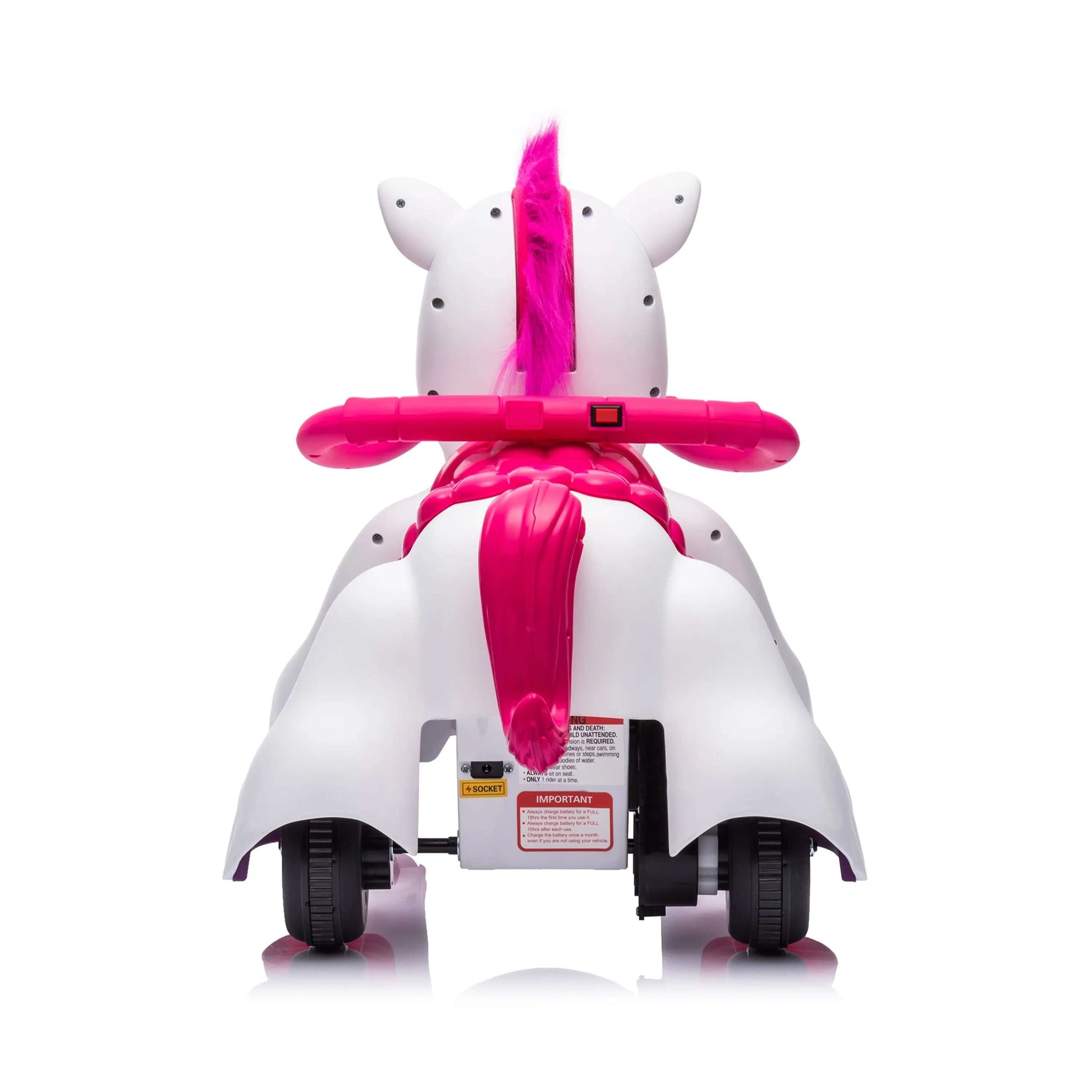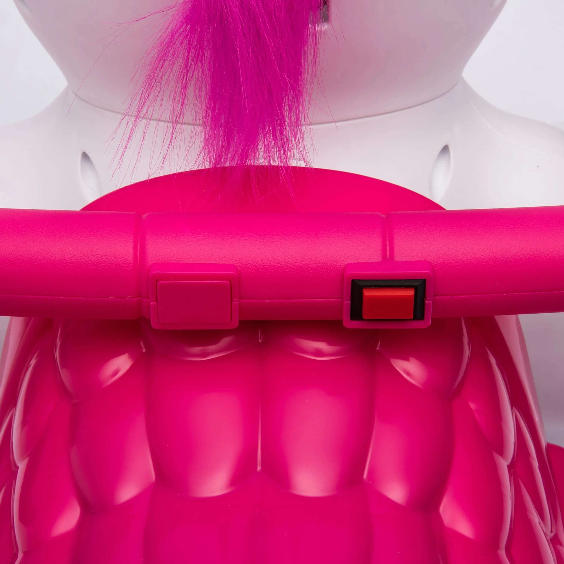 Bring the magic of fairytales to life with the Unicorn Ride-On Toy! This 6V ride-on is perfect for toddlers aged 18+ months. It features enchanting lights and sounds, adding to the fun. The toy includes a comb and brush for grooming the unicorn's mane and tail, and an interactive carrot that triggers eating sounds when held to the unicorn's mouth.