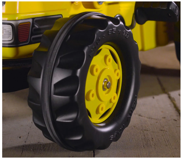 The Caterpillar Kid Tractor with Front Loader is a tough pedal tractor with a smooth finish. It comes complete with a front loader that can be raised and lowered, scooped and tipped using the levers. It has a rear detachable hauling trailer. The oversized resin tires have long lasting rubber tread strip. The mechanical features include a strong 12mm thick rear axle, covered integral fixed wheel chain drive, a pedal crank with eccentric bearing chain tensioning system, anti slip pedals, and a heavy duty front axle with suspension.