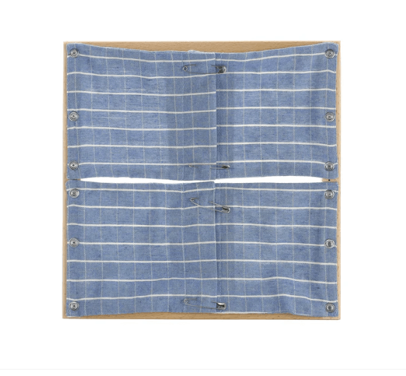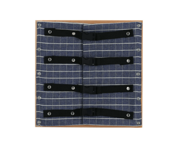- 12 different frames with a variety of fasteners, such as buttons, zippers, ties, and buckles.