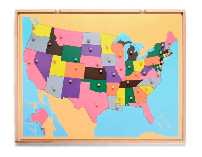 The Puzzle Map Cabinet includes 8 maps: World, Europe, North America, South America, Africa, Asia, Australia, and the USA. Each map is designed with an open back and comes with its own tray. This unique design allows for easy handling and promotes self-correction. The maps are strong and sturdy.
