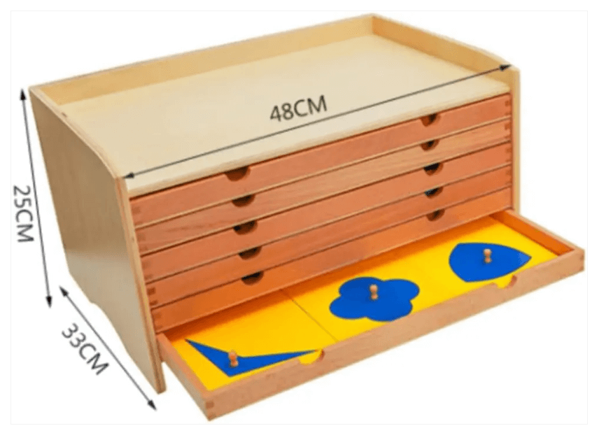 The Geometric Cabinet introduces the child to plane geometry. A six-drawer cabinet containing 35 geometric insets and frames.