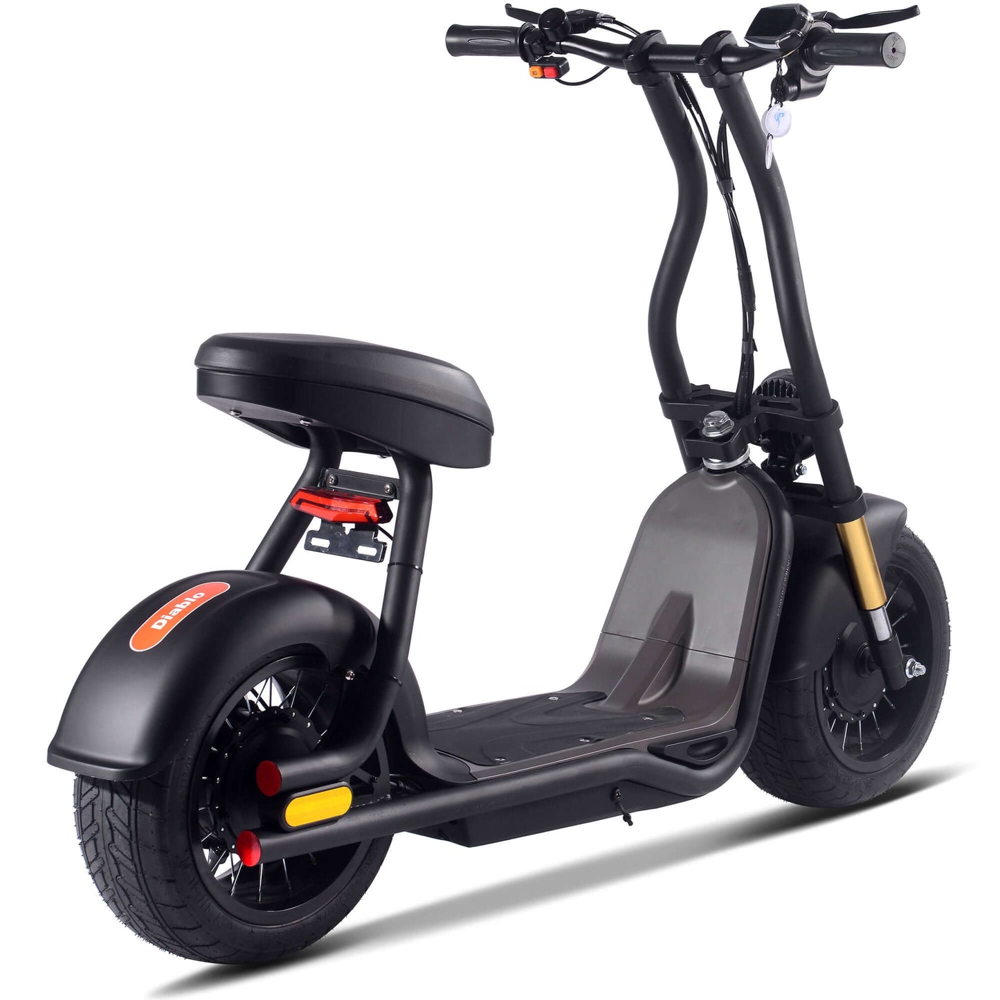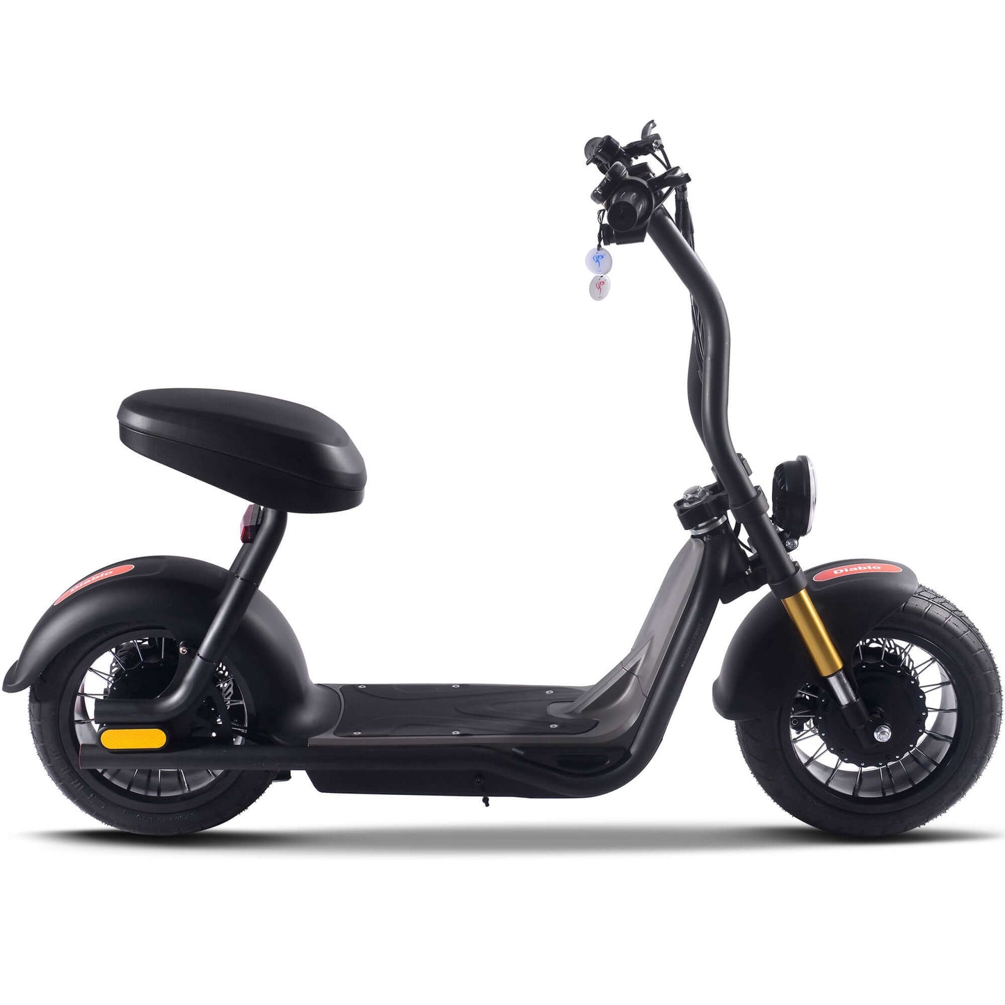 Introducing the new MotoTec Diablo 48v 1000w Hub Motor Lithium Powered Electric Fat Tire Scooter. Ergonomic shapes, large padded seat, LED headlight & brake light, front suspension with large street tires give this scooter a lot of attitude. Comes standard with front & rear disc brakes, key start and battery meter. This top of the line model features a rear hub motor with generous torque and performance, ready to tackle any terrain.