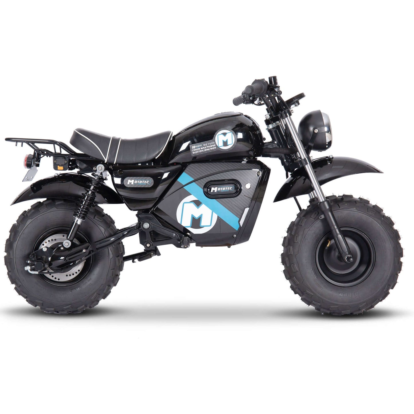 Introducing the MotoTec 60v 1500w Lithium Electric Mini Bike! Just like the ones your parents used to drive, only safer and easier to use. Powered by a brushless 1500 watt electric hub motor, twist throttle for easy operation, large front headlight and key start. With it's rugged steel frame and huge knobby tires, this mini bike is built tough to handle the roughest of terrain.