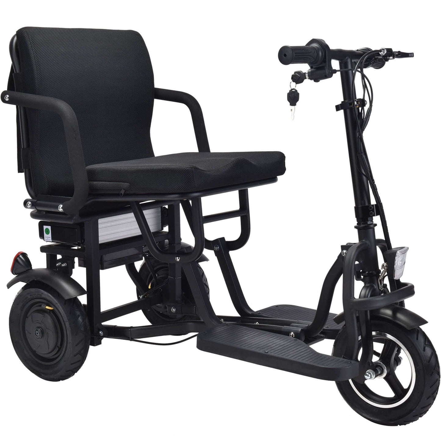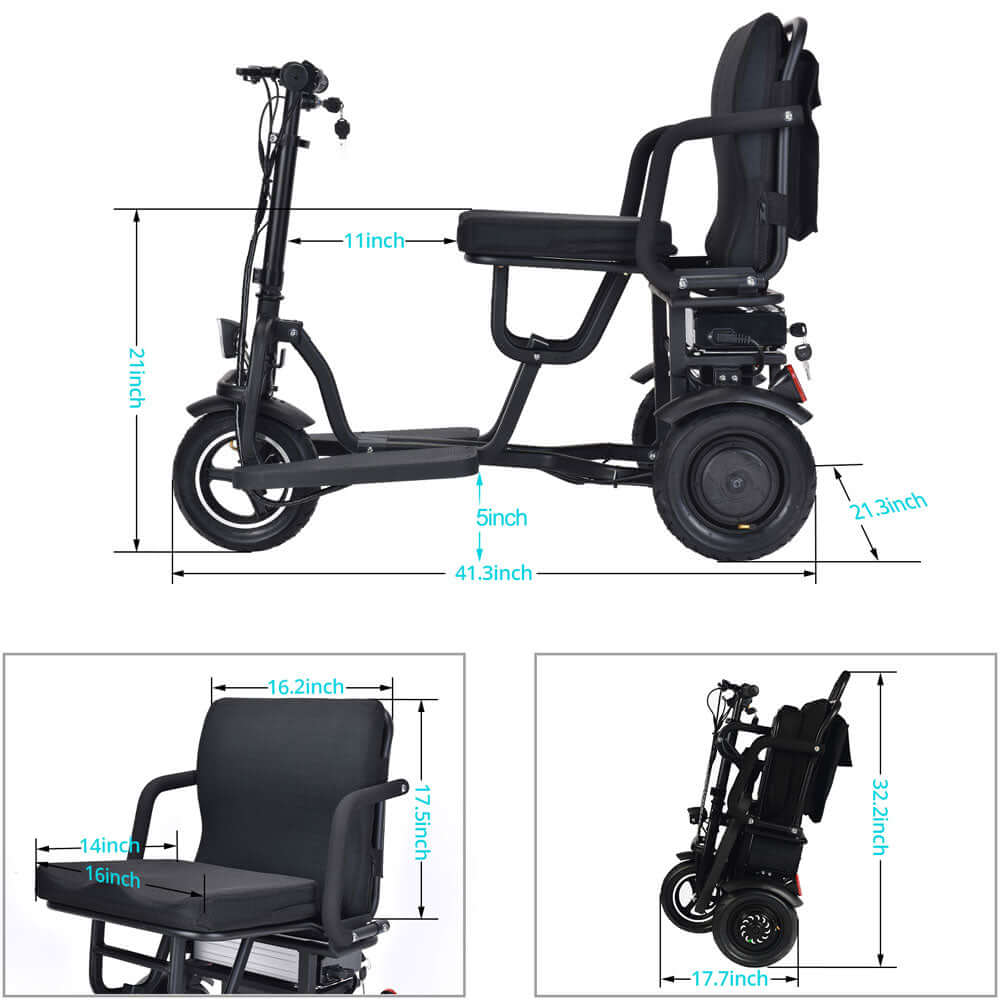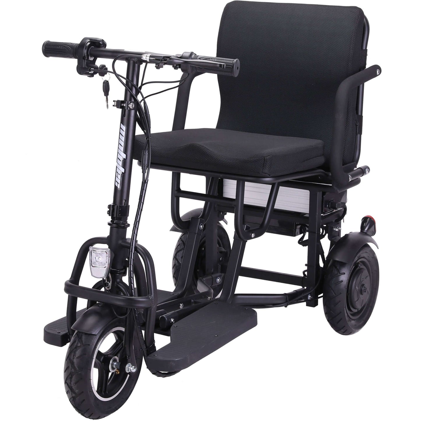 Introducing the 48v 700W Folding Mobility Scooter by MotoTec. Its compact, three wheel styling makes for a sharp turning radius, 2 hub motors built into the rear wheels provide amazing torque for riding up inclines with its light weight durable frame made from Aluminum. The lithium battery is light weight and lasts longer than your standard competing lead acid models.