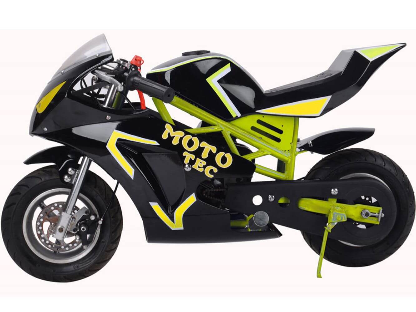 The MotoTec Pocket Bike is the ultimate kid or adult ride! Great for driveway and parking lot fun, cruise around cones and speed through trails with ease. Comes standard with front & rear disc brakes and large 11 inch pneumatic street tires.