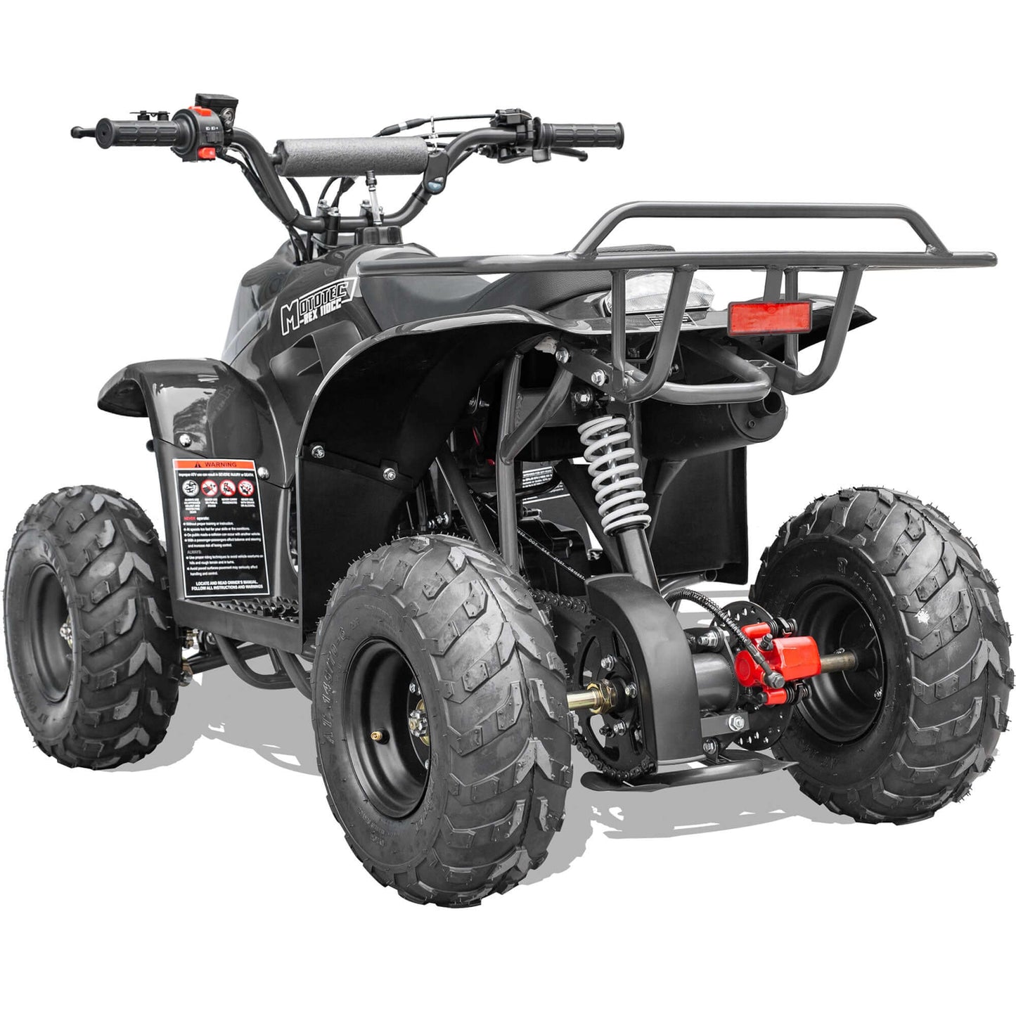 Introducing the new MotoTec Rex 110cc 4-stroke Kids Gas Powered ATV, this beast is ready to tackle any off-road terrain for beginner to intermediate riders. Push the thumb throttle and listing to the engine sing with 7 horse power for maximum entertainment. This 4-wheeler is for 10+ years old. Comes standard with self-adjusting rugged chain drive, front drum and hydraulic rear brakes, adjustable handlebars, front and rear suspension, large air-filled tires and a 4-stroke 110cc engine. Now featuring a parent remote control kill switch for safety. Don't wait, the thrill of trail riding awaits.