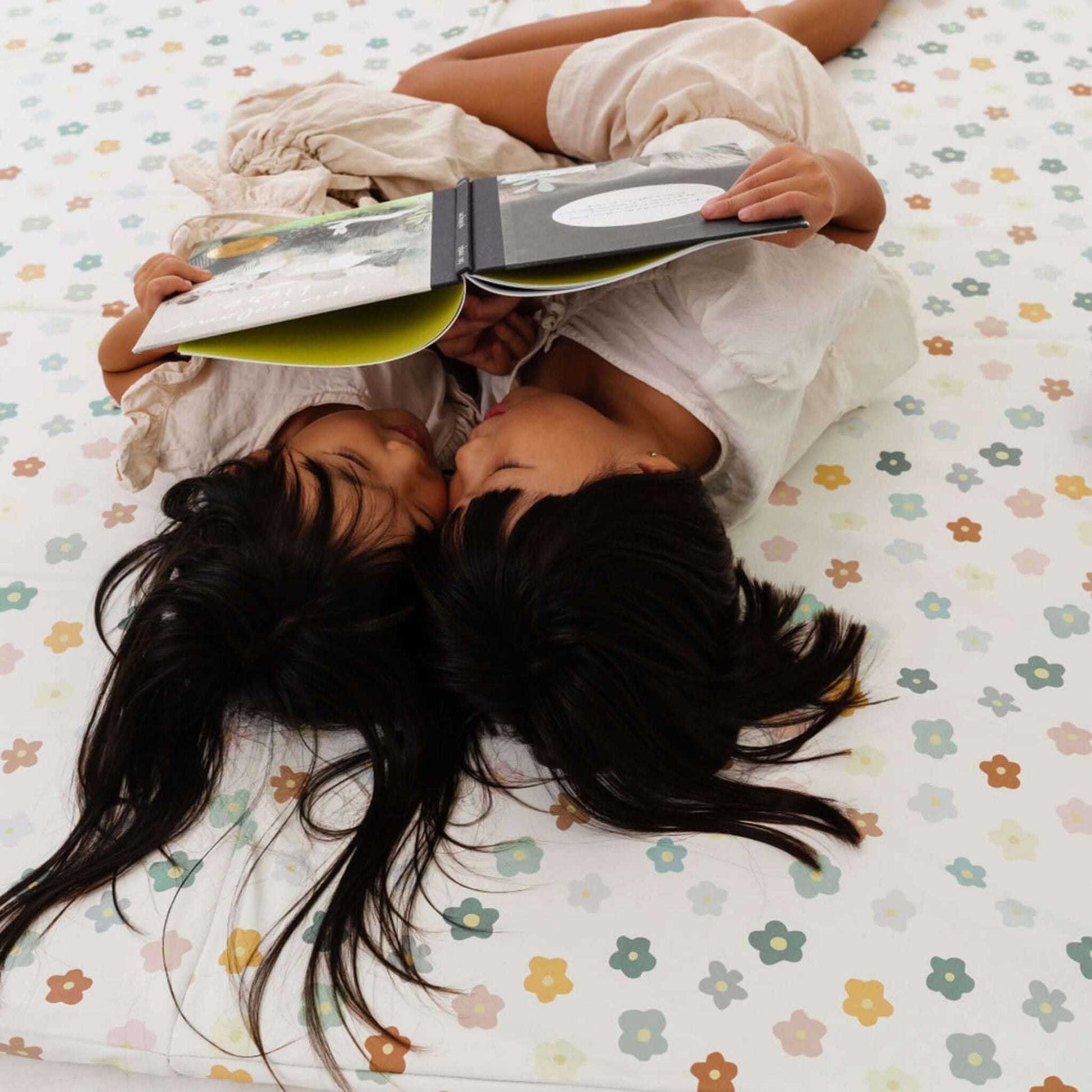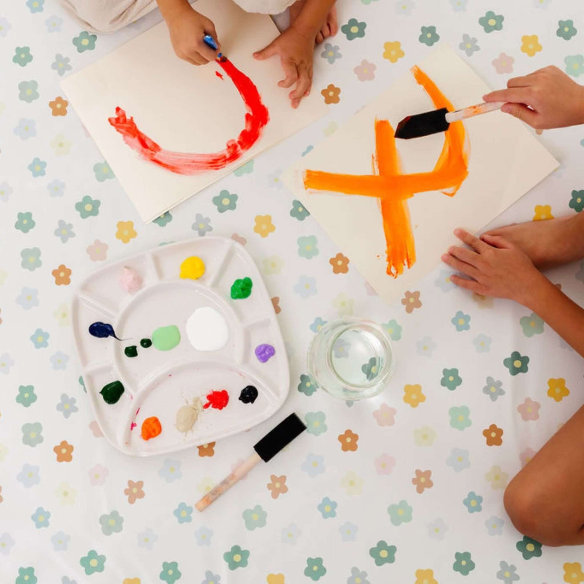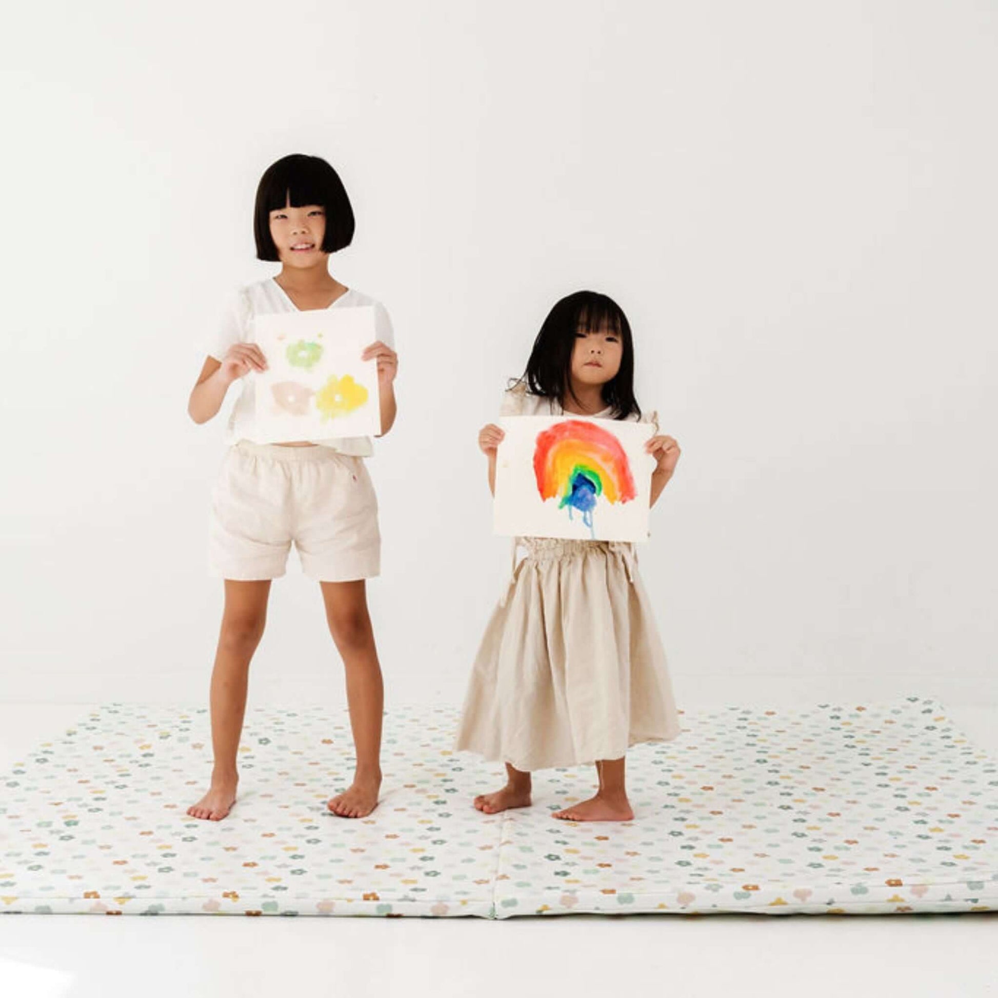 - Vegan leather play mat in a playful floral print of stylized blooms in a rainbow of muted, neutral colors.
