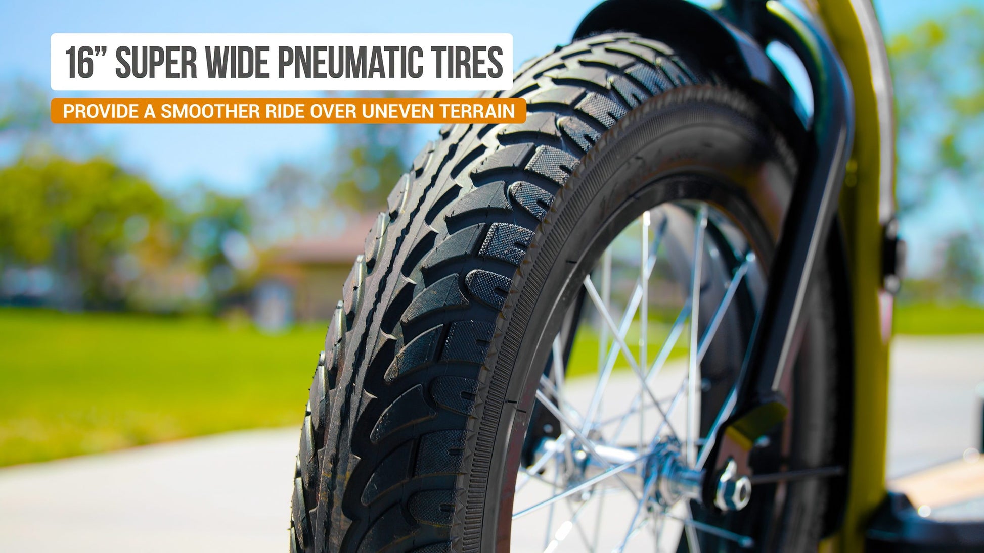 - Wheels: Spoked, 16″ (406 mm) with superwide pneumatic tires