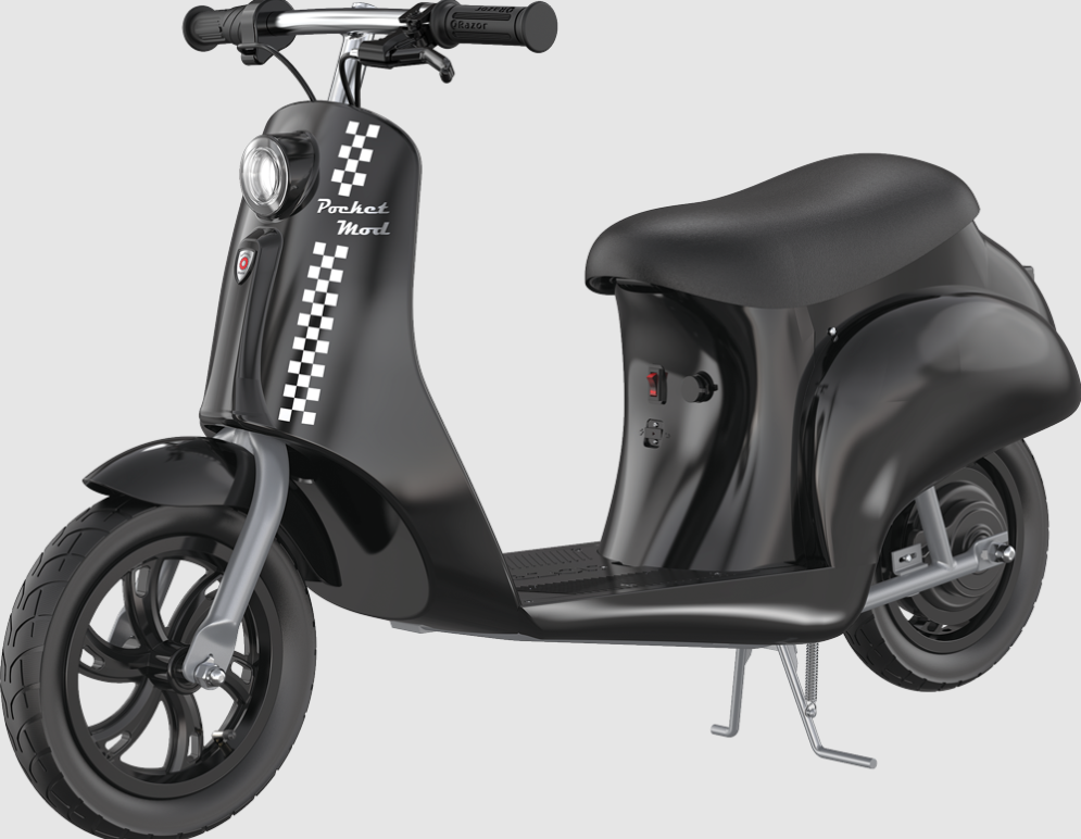 With authentic styling like a padded seat, twist-grip throttle control, and hand-operated brake, the Pocket Mod is a scaled-down version of the classic Euro scooters that inspired it. Customize your ride by selecting from a range of colors, decals, and accessories.