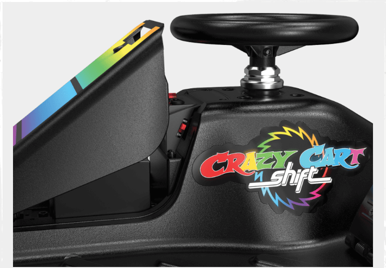 Crazy Cart Shift Lightshow is powered by Razor’s patented Power Core™ hub motor technology — a maintenance-free drivetrain system that is both powerful and efficient. The rechargeable 12V sealed lead-acid battery provides up to 40 minutes of continuous use in the “High” setting and the 1:1 steering ratio delivers the ultimate steering responsiveness for performance driving.