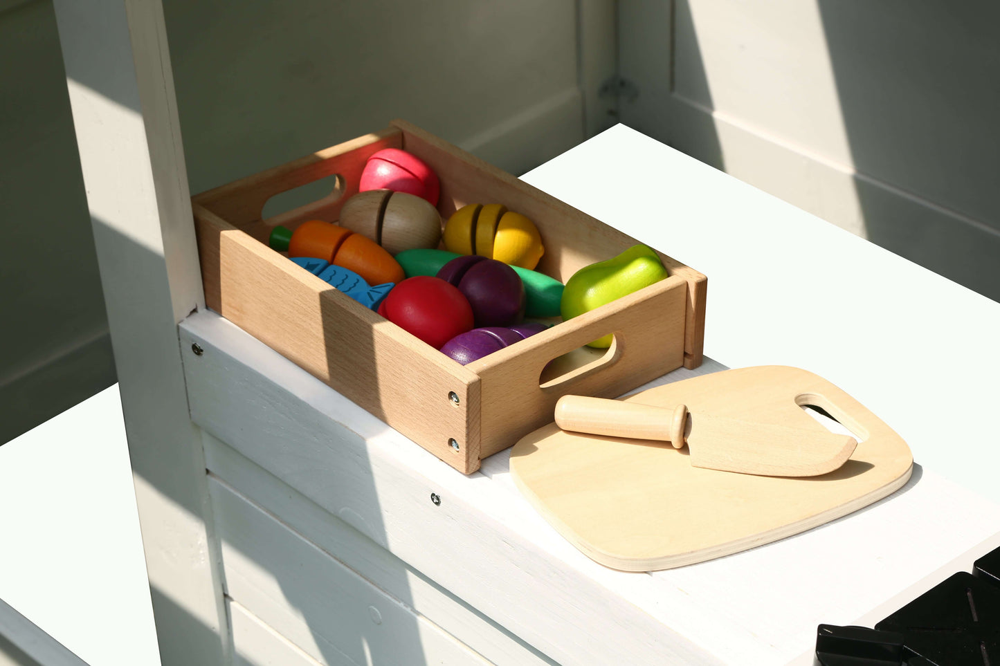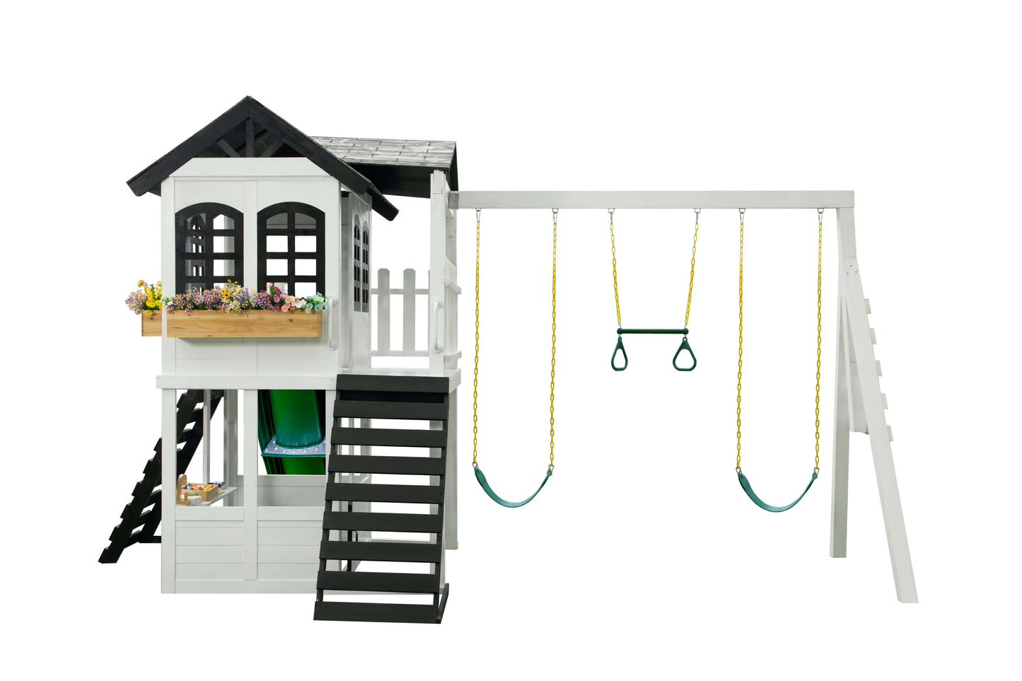 2MamaBees Reign Two Story Playhouse will create hours of sensory play while also helping your little one explore the world of imagination. The beautiful black and white farmhouse design will create a stunning addition to any backyard. The Reign Two Story Playhouse includes a built-in kitchen, beautiful wooden play food and cedar window boxes to create your own potted garden. Swing Attachment is sold separately.