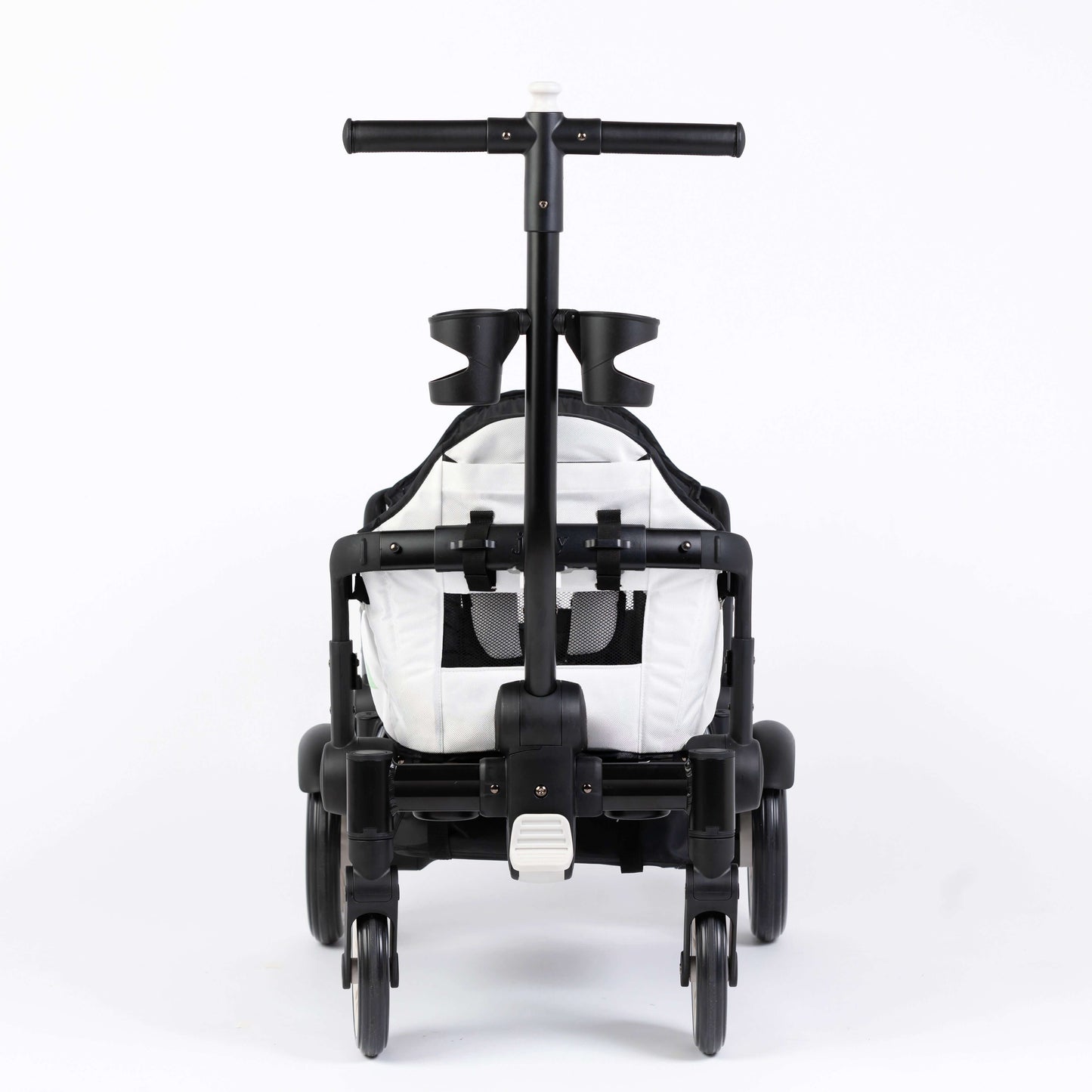- Let's talk features! Our stroller & wagon combo comes with an array of must-have components. The all-terrain wheels and mesh footwell allow you to easily navigate any terrain, whether it's the suburbs, cities, or country roads. Your kids will love the snack/book/tablet tray, and parents appreciate the convenience of an easy one-hand fold. We ensure safety with the 5-point harness, and the adjustable handlebar allows for an easy transition between push-and-pull modes. Each wagon includes a built-in storage basket, 2 cup holders, and snack tray.