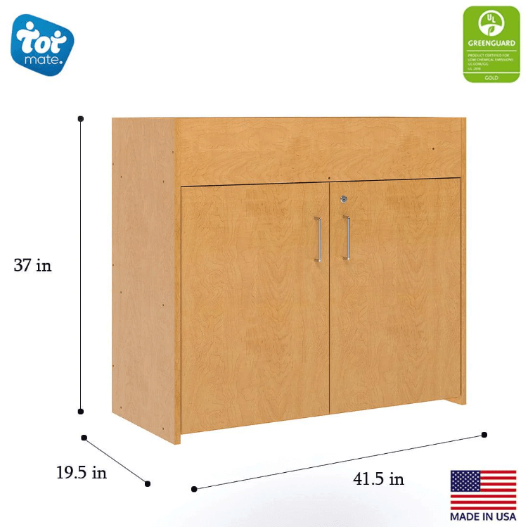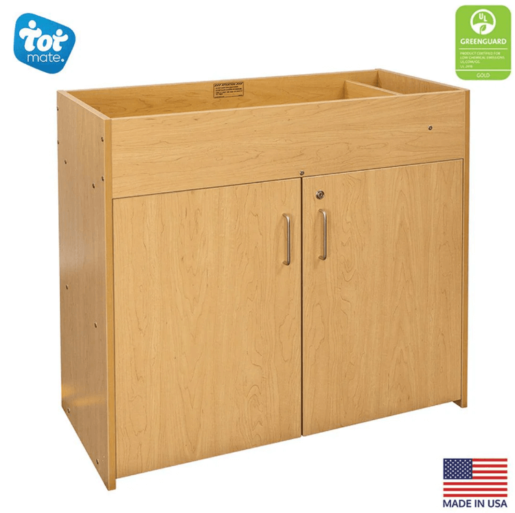 Combine storage and safety with Tot Mate’s Small Baby Changing Table. Create an ideal diaper changing station for your daycare or home, even in smaller spaces. Your baby will be cradled in the 7” deep changing well during diaper changes, and the laminate surfaces make sanitizing a breeze. Safety features such as enclosed hinges secure items and a lockable door keeps curious hands away.