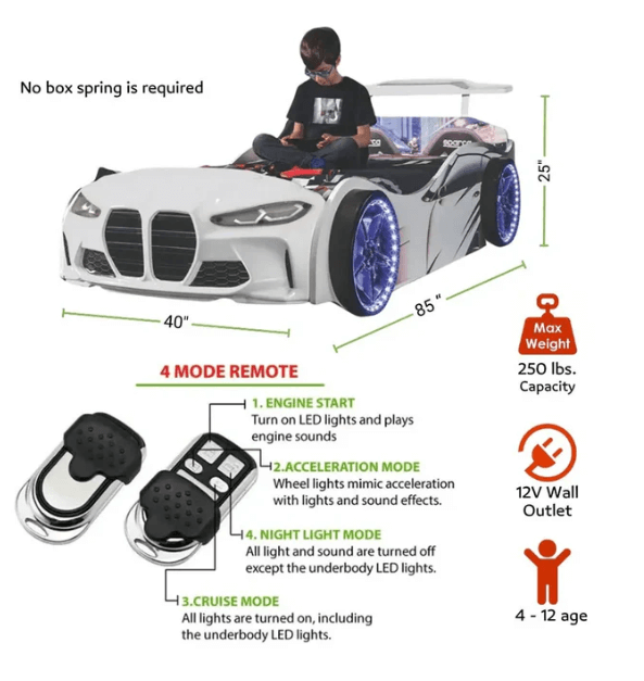 The GTX Race Car Bed is the coolest bed around! It comes with the coolest remote control. You can control the sound and light system of the car bed with the remote control.