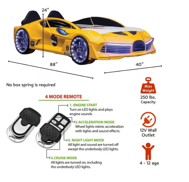 The Aero Extreme Race Car Bed includes a remote control. With it, the different levels of the light, sound, and horn system of the car bed are controlled.