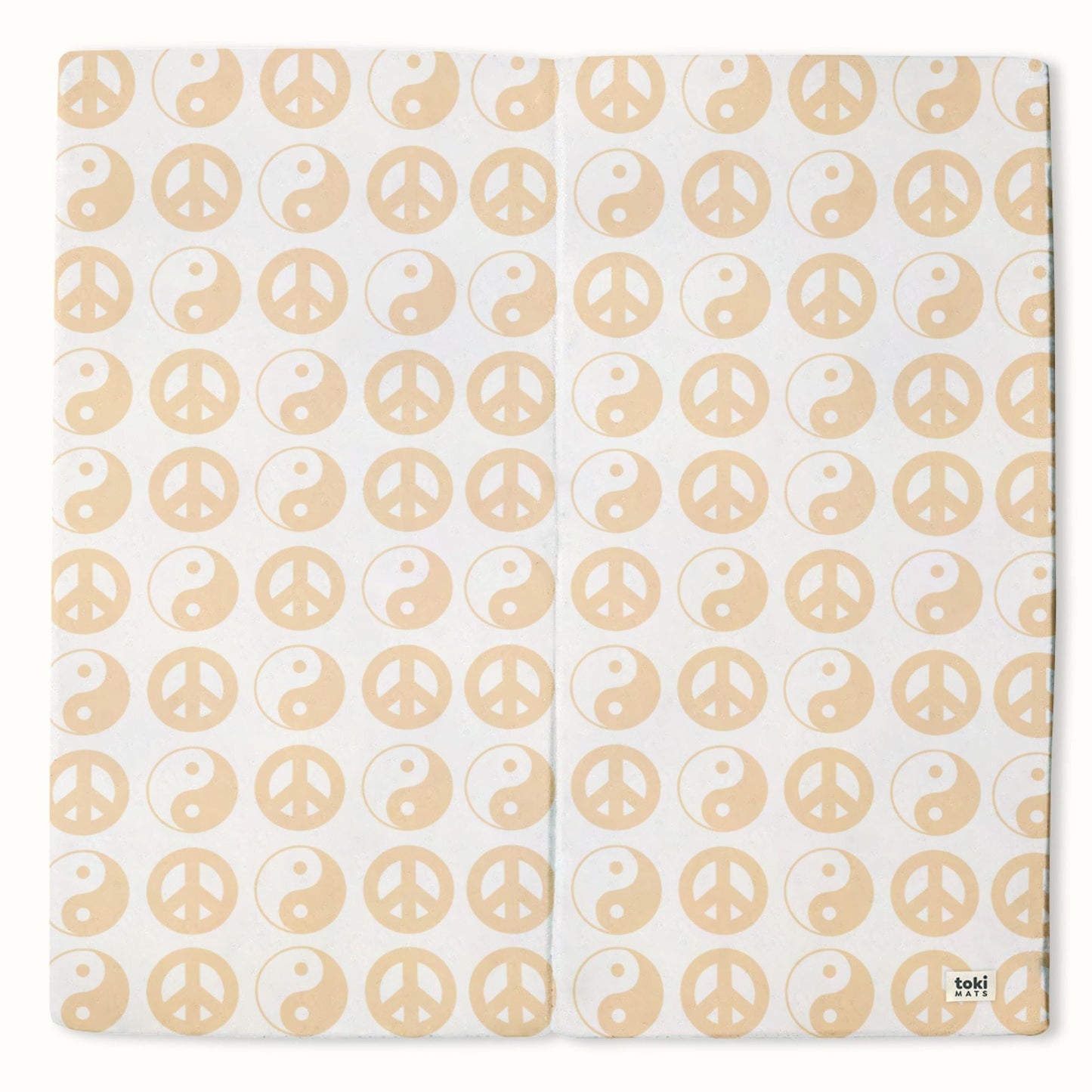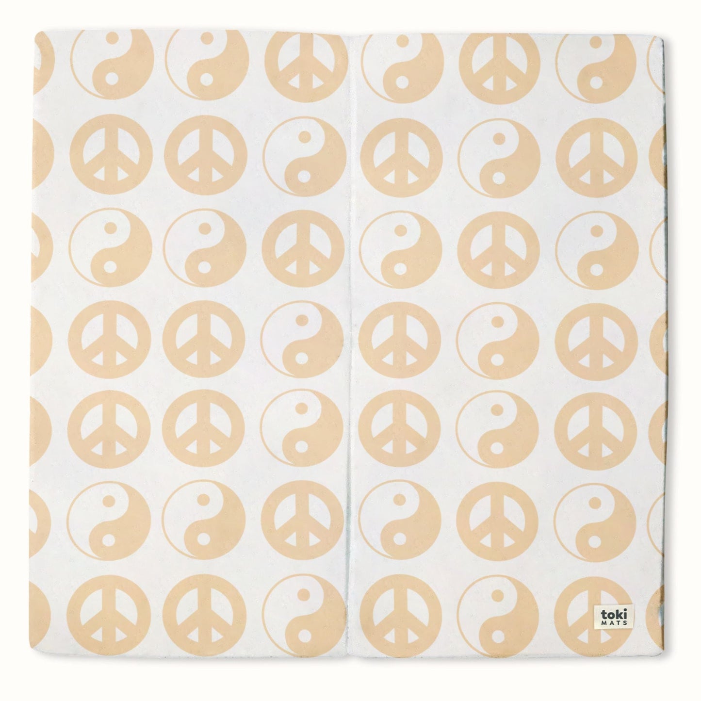 - Top: An alternating pattern with a yin-yang symbol and a peace symbol in a dark beige over a white background. Bottom: An alternating pattern with a yin-yang symbol and a peace symbol in a white over a dark beige background.