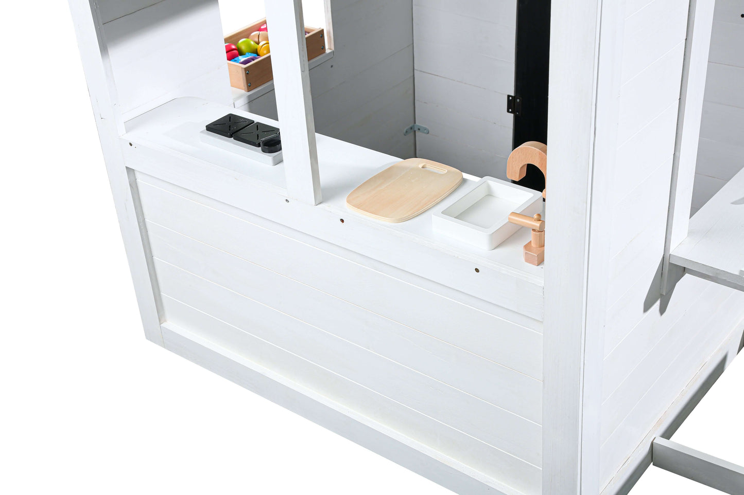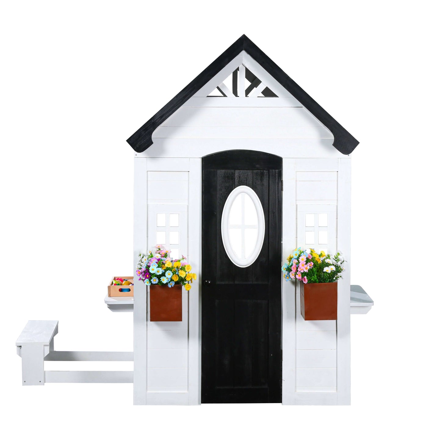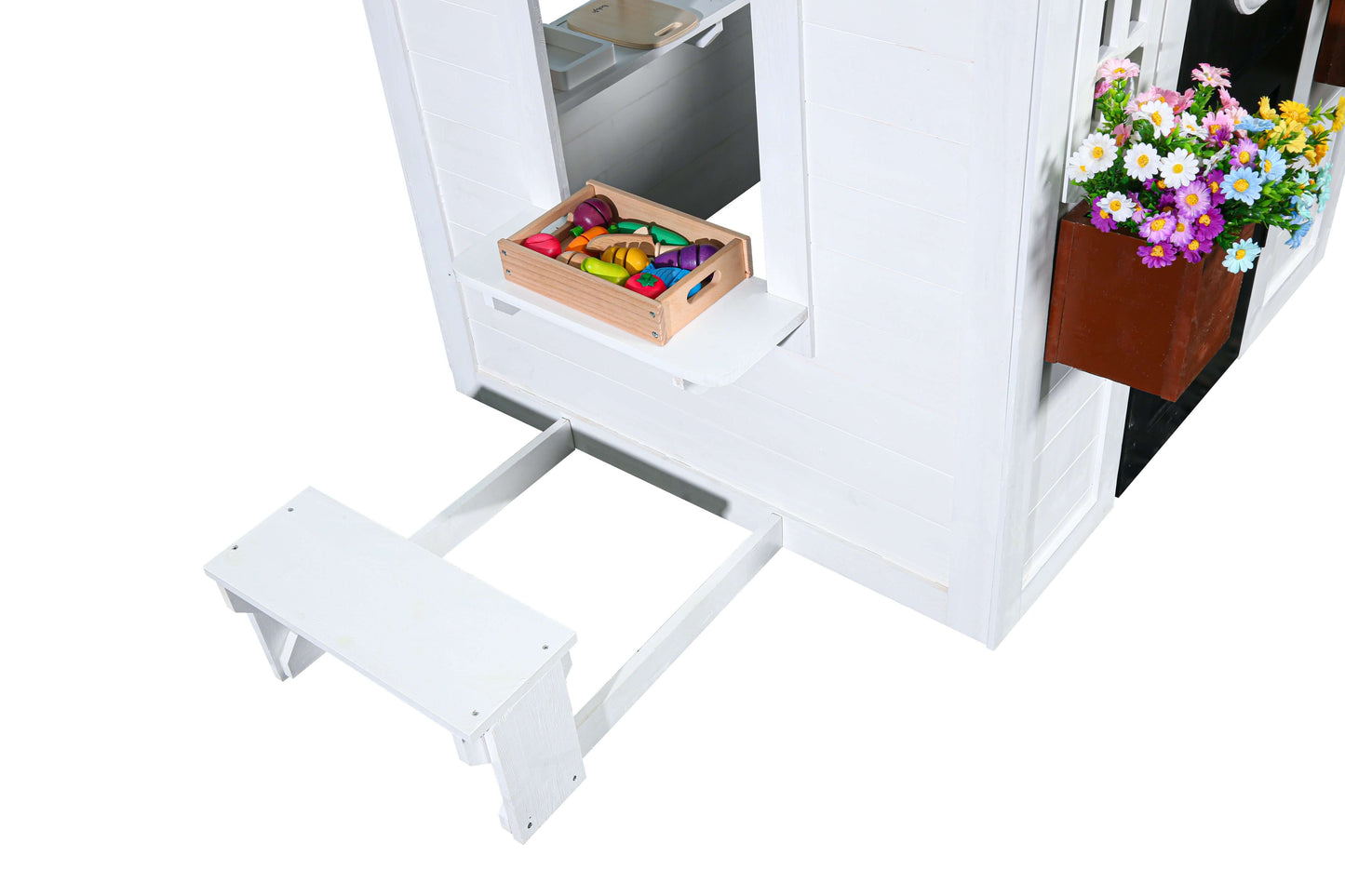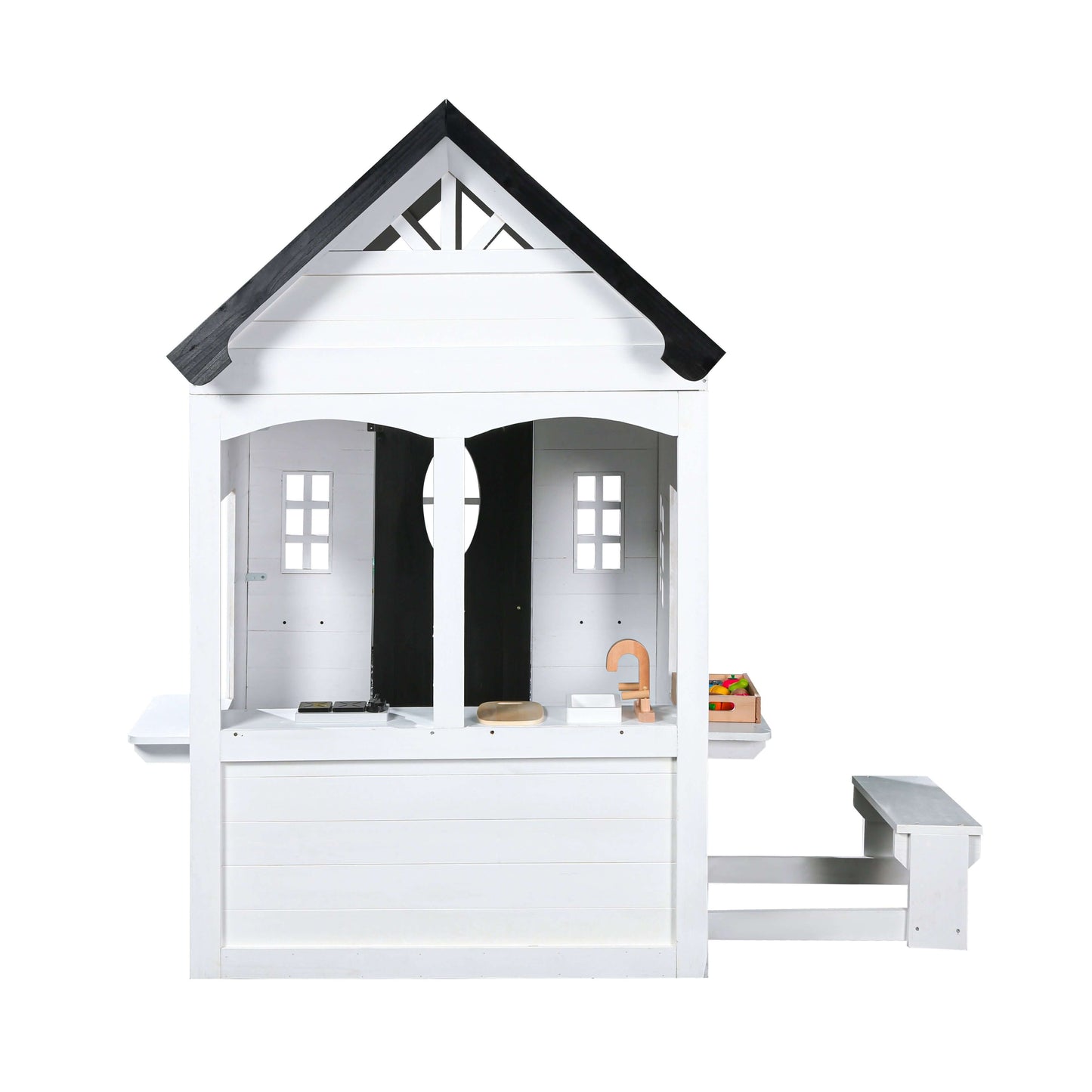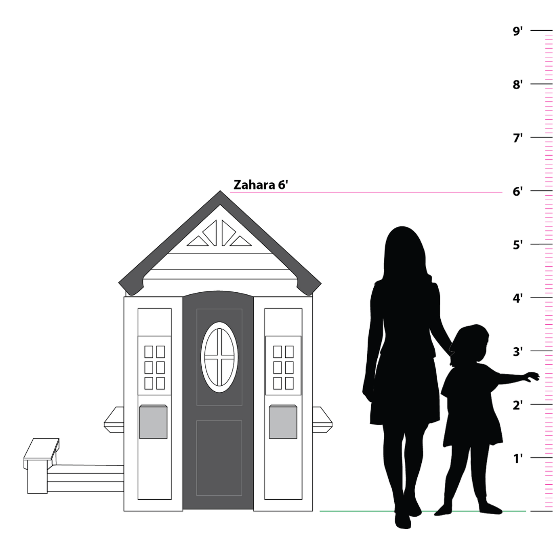 2MamaBees Zahara Playhouse will create hours of sensory play while also helping your little one explore the world of imagination. The beautiful white and black farmhouse design will create a stunning addition to any backyard. The Zahara Playhouse includes a built-in kitchen, beautiful wooden play food and cedar window boxes to create your own potted garden.